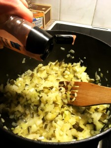 Jossain syvällä, hyvin syvällä sisimmässäni asuvaa insinööriä tällaiset pikkutarkat ohjeet lämmittävät. Paista sipuleita viitisen minuuttia. Lisää hunaja. Sekoita hyvin ja lisää suolakurkut. Paista ahkerasti käännellen toiset viisi minuuttia. Välillä nimittäin uusia reseptejä kokeillessa revin pelihousujani epätarkkojen ohjeiden kanssa. Lisäksi tästä oppi uusia niksejä: pippureiden herättäminen.