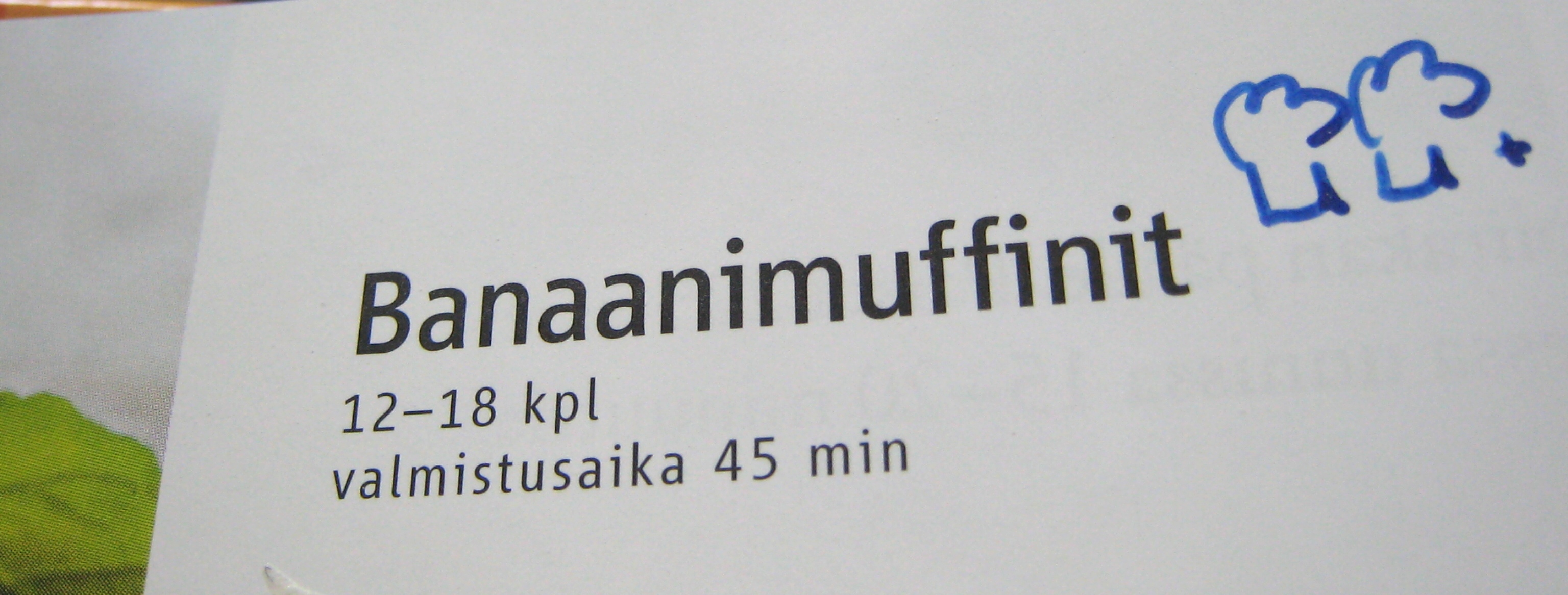Leivoimme pikku apulaisen kanssa banaanimuffineja, jotka vietiin tarhan tädeille kiitokseksi ja hyvän kesän toivotukseksi. Ohje löytyi Kotilieden ja Marttojen julkaisemasta Kodin hyvä arki -kirjasta (2012) ja kuorruteohje Dansukkerin sivuilta.
