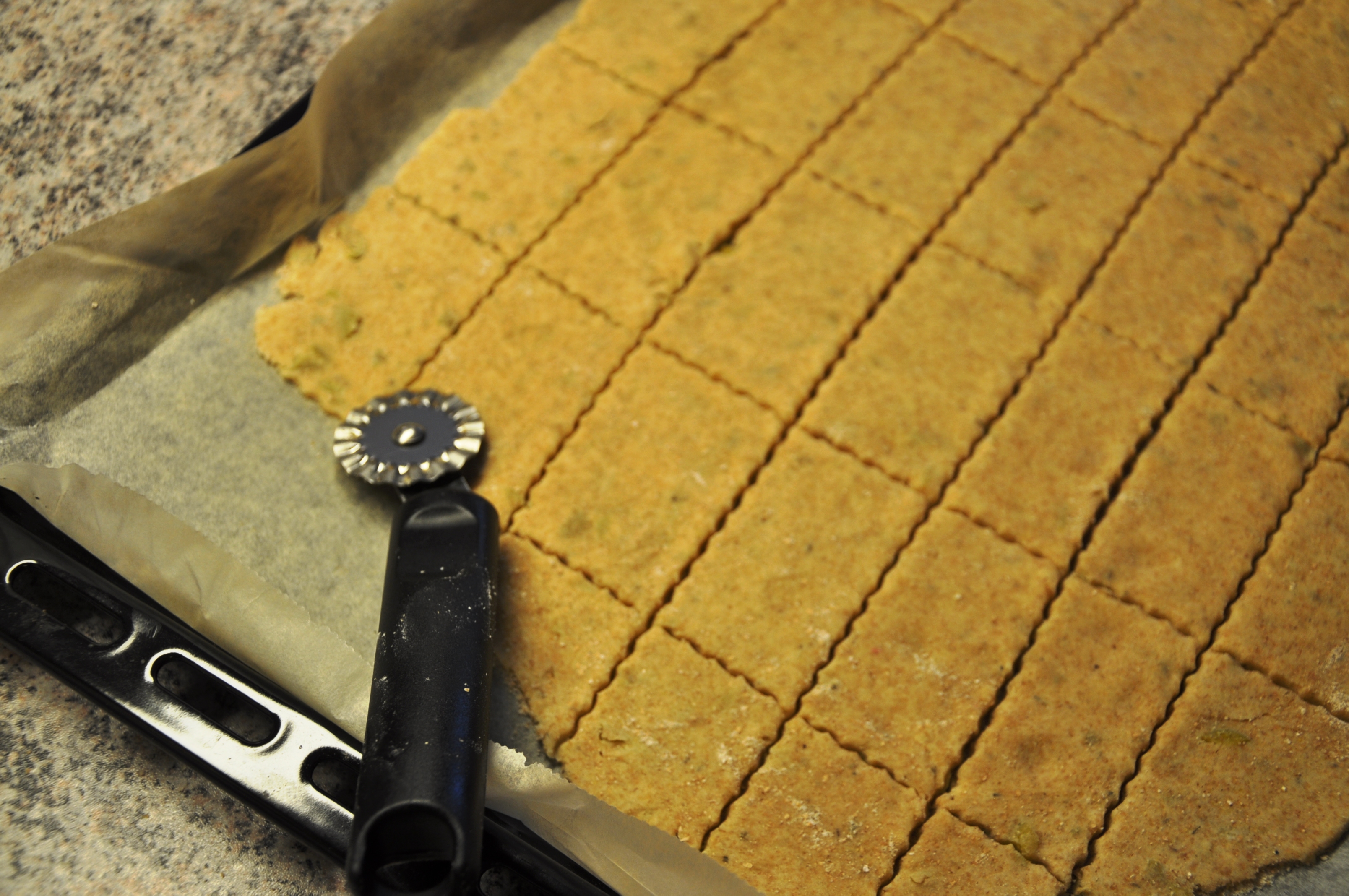 Vaikuttaa aika simppeliltä ja nopealta, varsinkaan jos kerta keksejä ei tarvitse edes irrotella toisistaan ennen uuniin laittamista. Tosin ehkä pitäisi lukea ohjeet vielä huolellisemmin. Yritin ekasta taikinanpalasta kaulita uuninpellin kokoista ja siitä tuli turhan laiha, sitten tavasin ohjetta uudelleen ja totesin, ettei tässä lue muuta kuin ”kauli leivinpaperin päällä levyksi”. Toisesta levystä kaulitsin sitten hieman paksumman ja tästä pellillisestä tuli parempia.