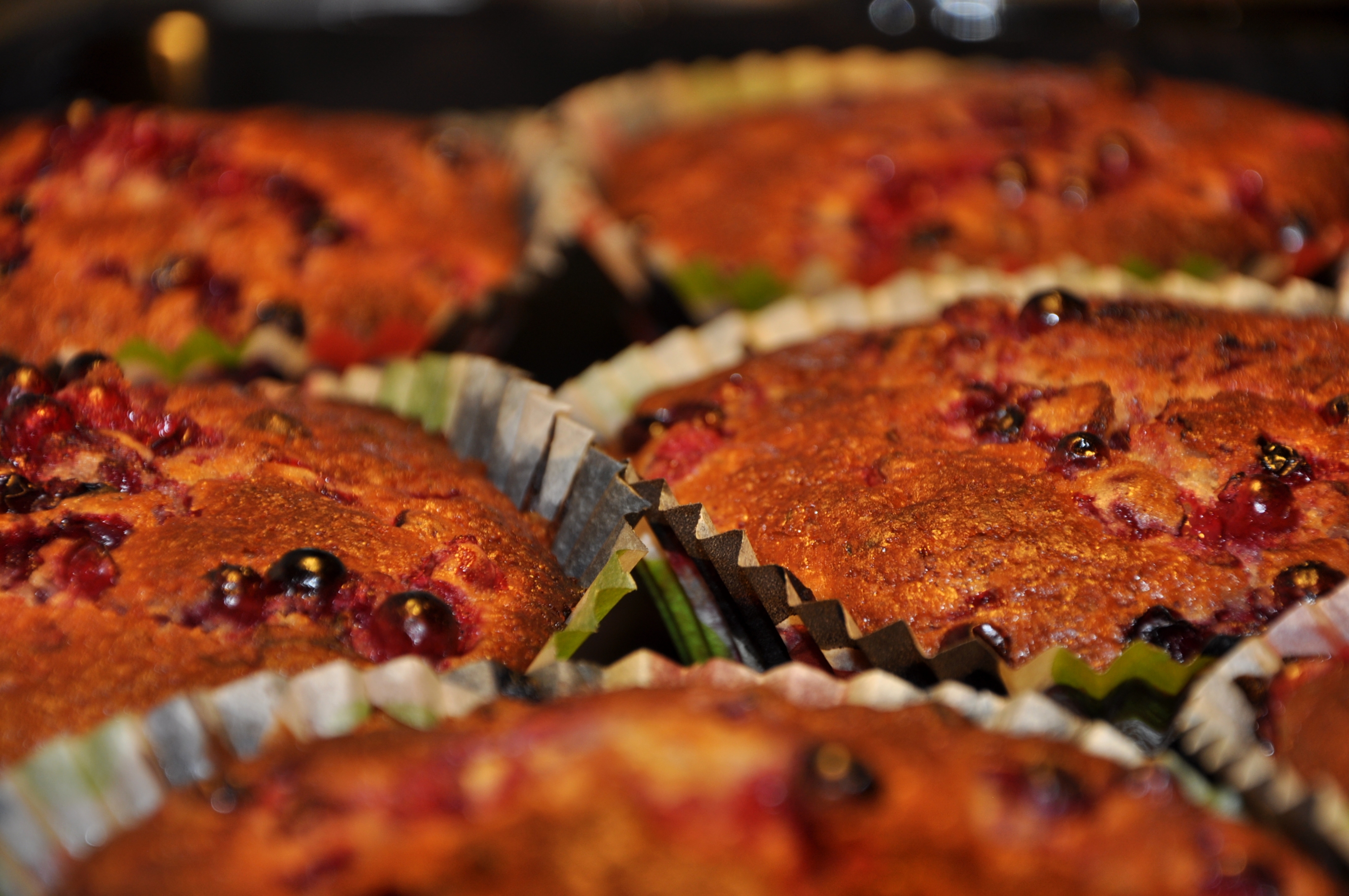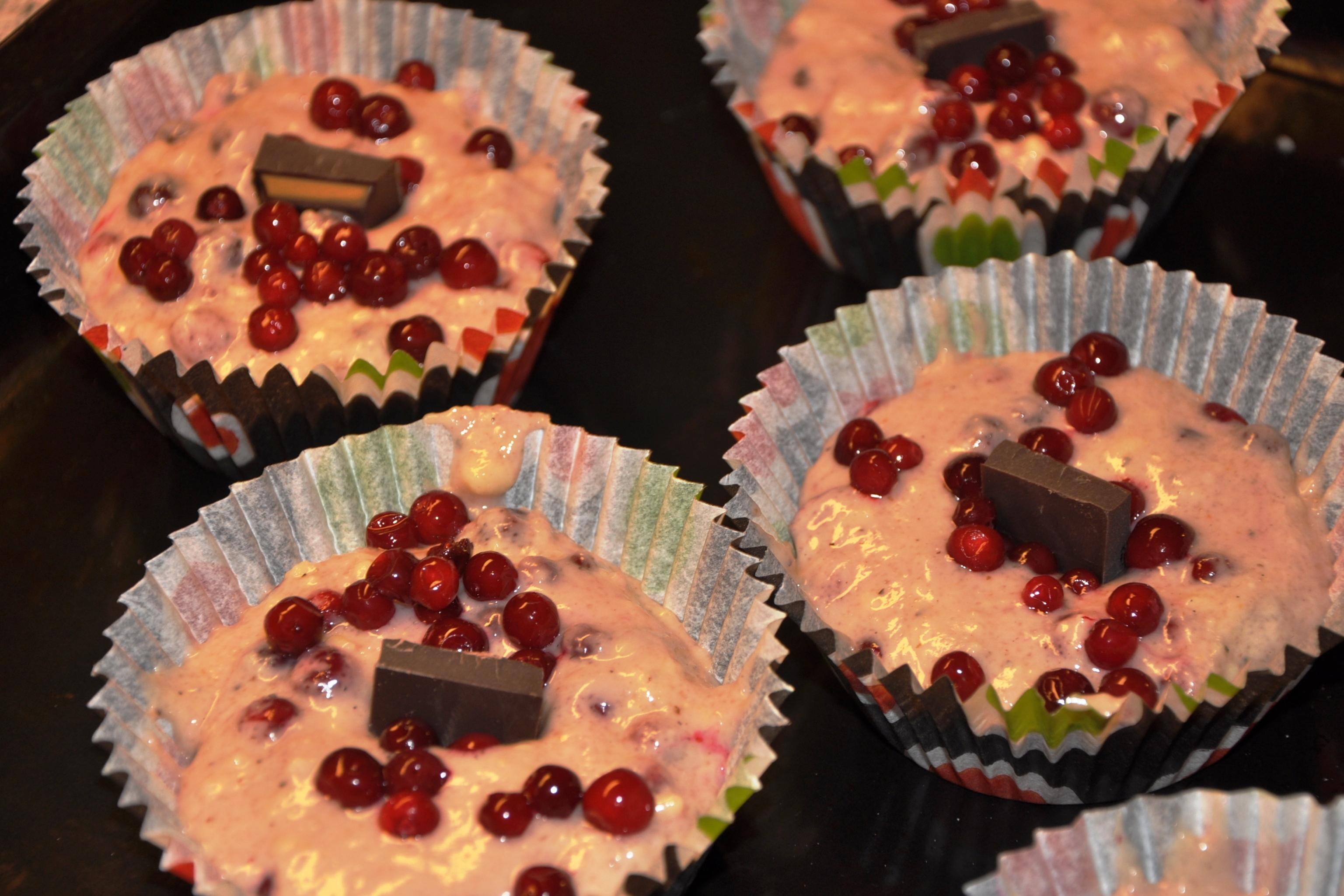 Hmm, kahdesti taikinaa tehdessä alkoi epäilyttää. Ensimmäisen kerran kohdassa kaksi, sillä piimä-margariini-muna-seos oli hiven kokkareinen. Toisen kerran, kun kerta laitoin vain puolisen tuntia pöydällä sulaneet pakastepuolukat taikinan sekaan, niin taikinahan oli jäistä, kun lusikoin sitä vuokiin. Lisäksi meidän muffinivuoat olivat niin isoja, että ohjeella tuli kahdeksan muffinia. Ja kaiken huipuksi muffinit eivät varsinaisesti kohonneet, vaan levisivät uunissa.