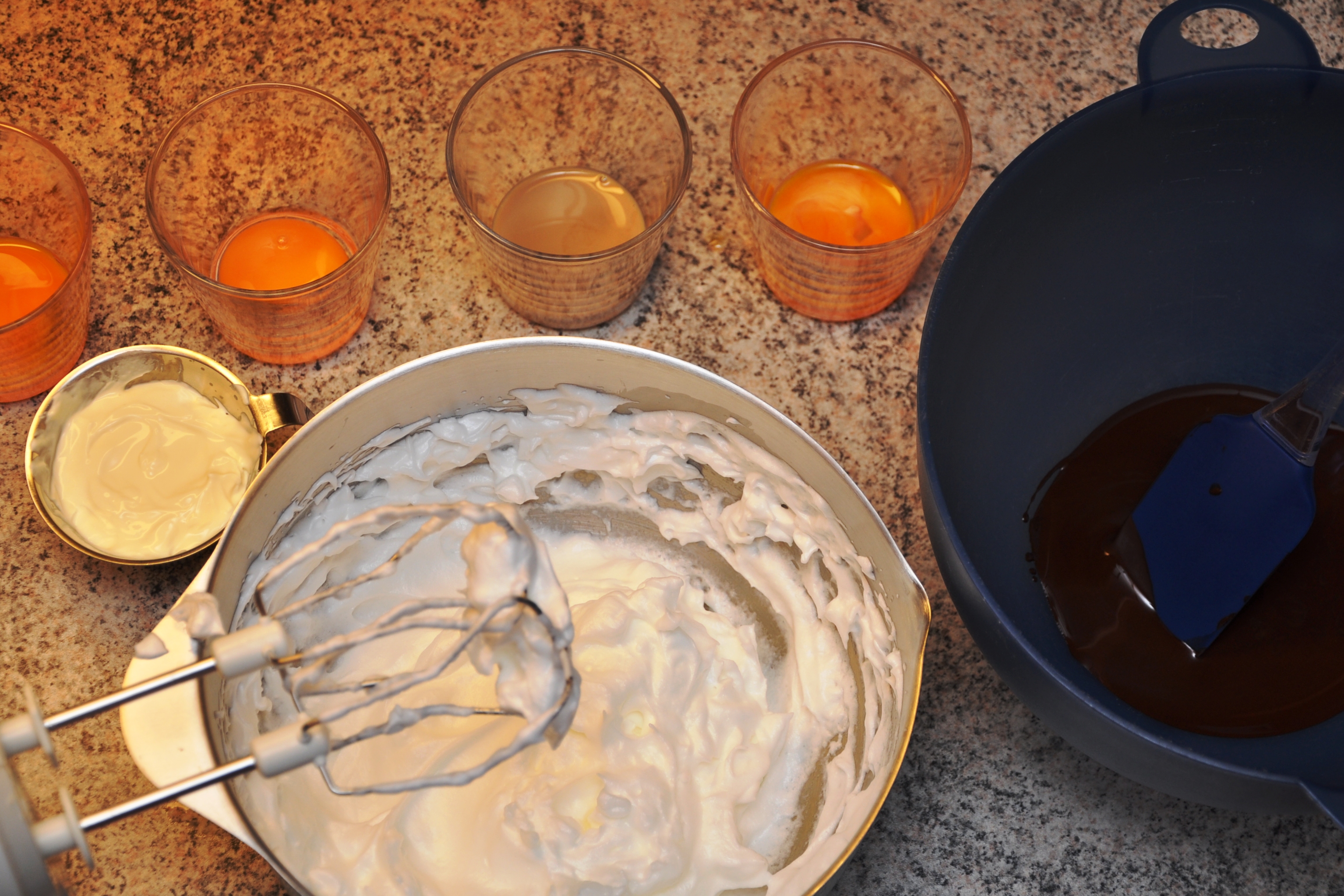 Kananmunien ja liköörin kannattaa olla huoneenlämpöisiä. Trust me. Sulata suklaa vesihauteessa. Siirrä isoon kulhoon jäähtymään. Erottele keltuaiset ja valkuaiset. Vatkaa valkuaiset ja sokeri vaahdoksi. Sokerin ansiosta vaahdosta tulee vähän kuin saippuavaahtoa mutta jämäkämpää. Sekoita Baileys jäähtyneeseen suklaaseen. Joo, tässä olin taas vähän hätäinen, ja vielä lämmin suklaa lähti paakkuuntumaan. Älä panikoi. Lisää keltuaiset erissä ja jatka sekoittamista. Sekoita joukkoon ranskankerma. Lopuksi nostele joukkoon valkuaisvaahto.