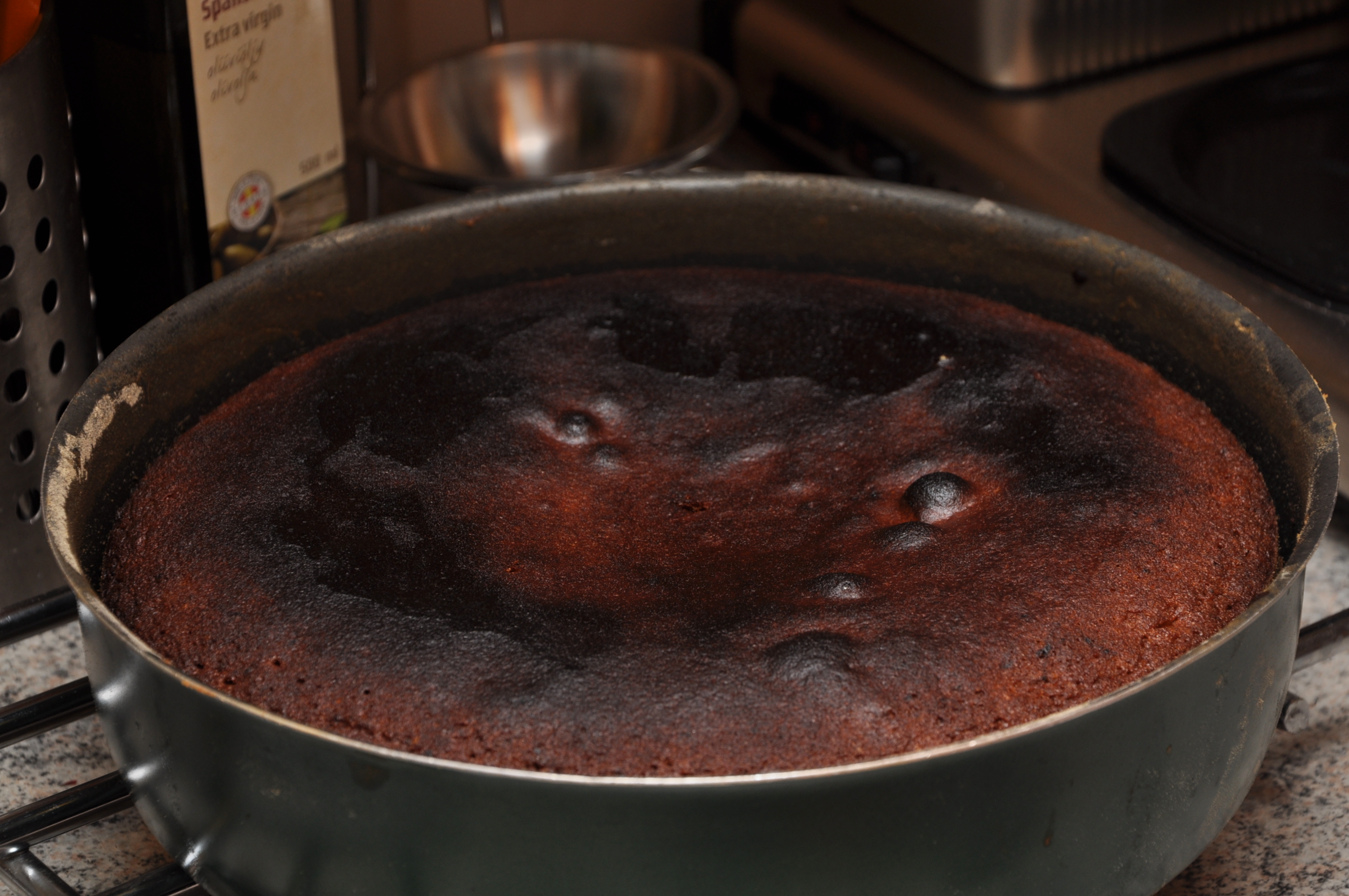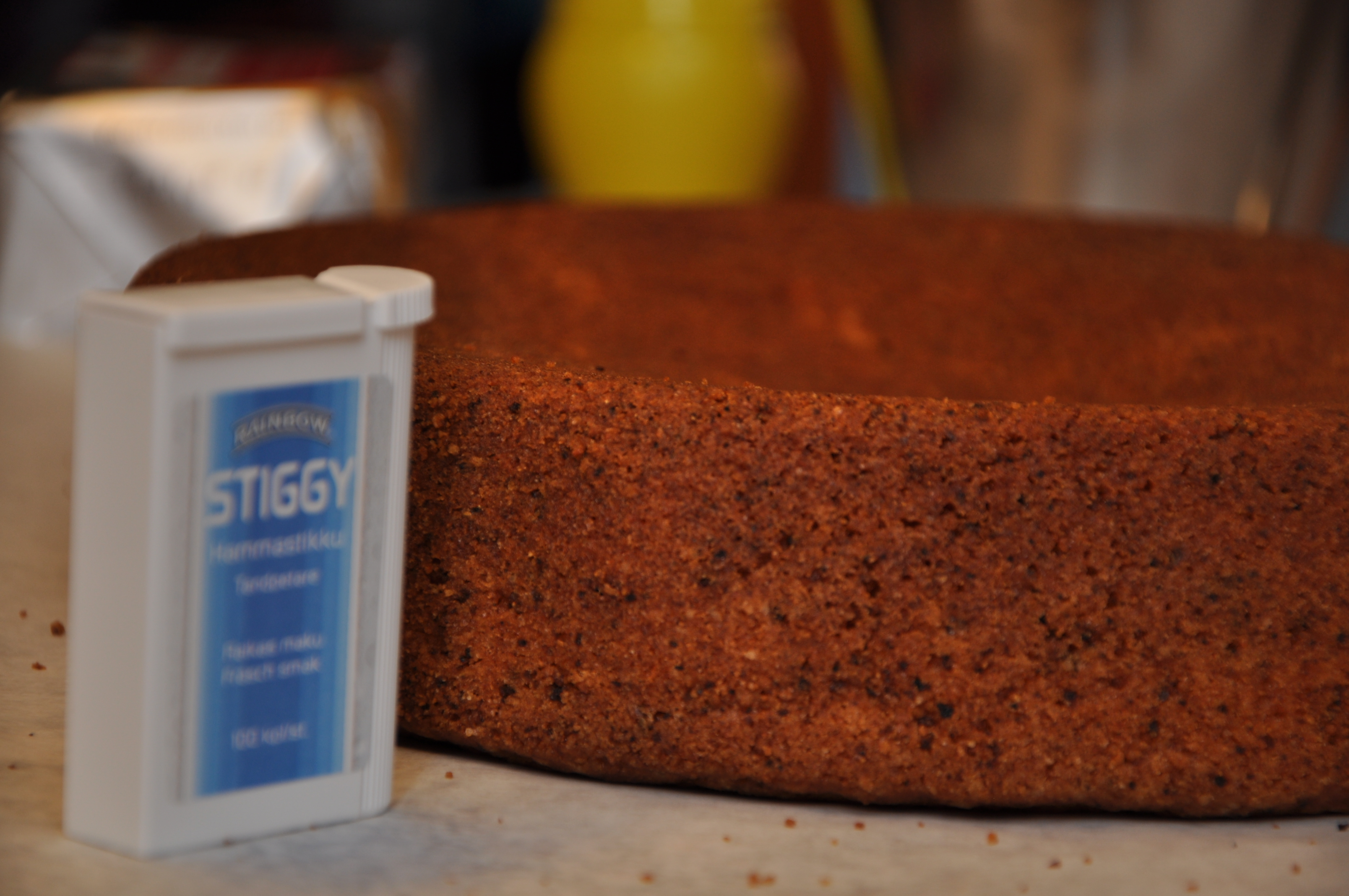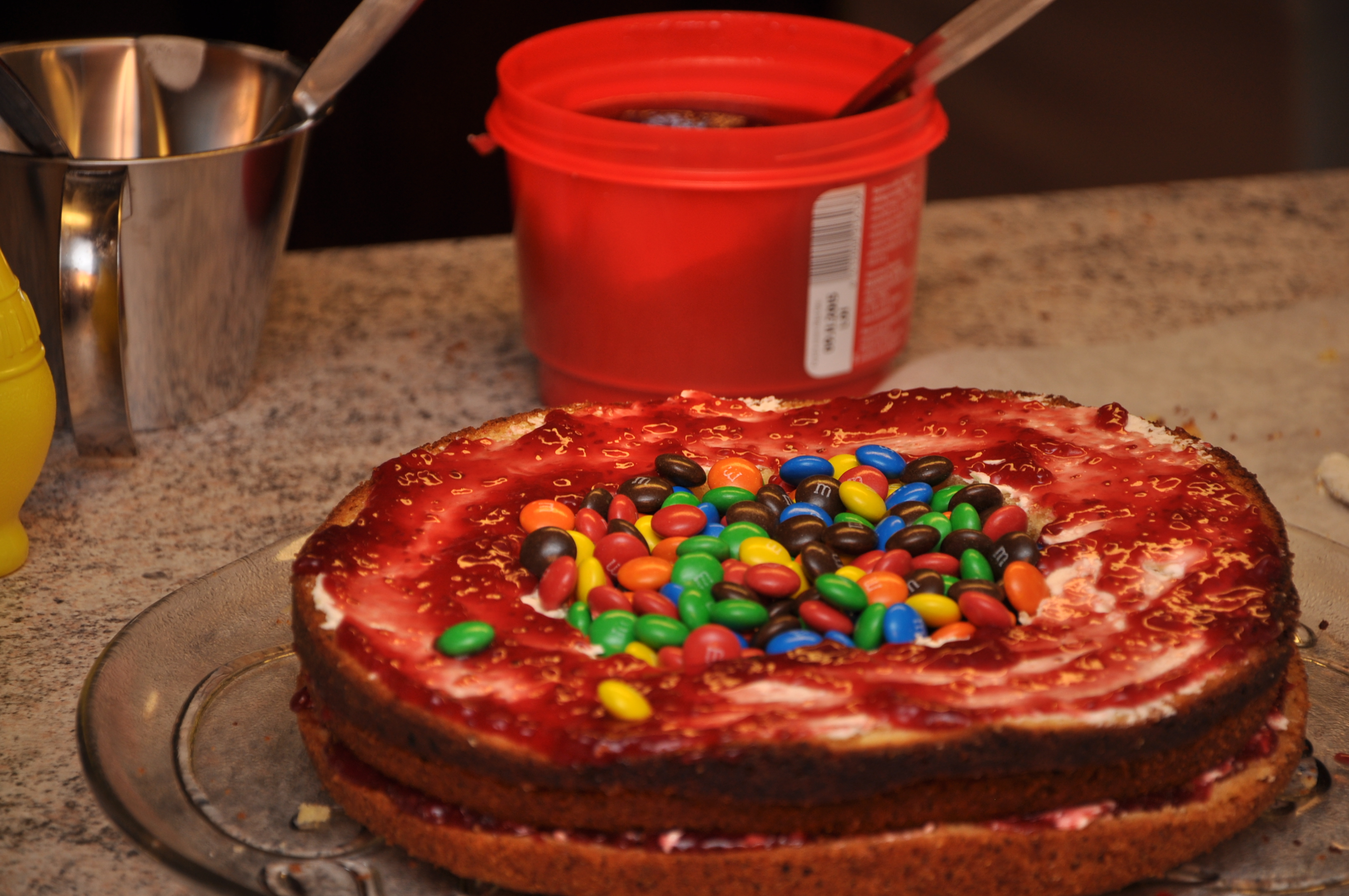 Onnistuin polttamaan ensimmäisen kakkupohjan. En tiedä epäonnistuiko palanut pohja muutenkin, sillä se suorastaan tihkui rasvaa, mikä ei vaikuttanut kovin herkulliselta. Lisäksi se oli niin matala, ettei siitä olisi leikattu neljää kerrosta. Hetken jo mietin, että teen uuden perinteisellä sokerikakkuohjeella, joka varmasti onnistuu ja maistuu lapsille. Sitten aloin miettiä, sulavatko M&M-karkit kostutetun pohjan sisälle. Ohjeen mukaista pohjaahan ei kostuteta ollenkaan. Lopulta tein pienen kokeilun: kostutin leipäpalan, heitin sen päälle karkkeja ja painoin toisen leipäpalan päälle, annoin olla hetken ai