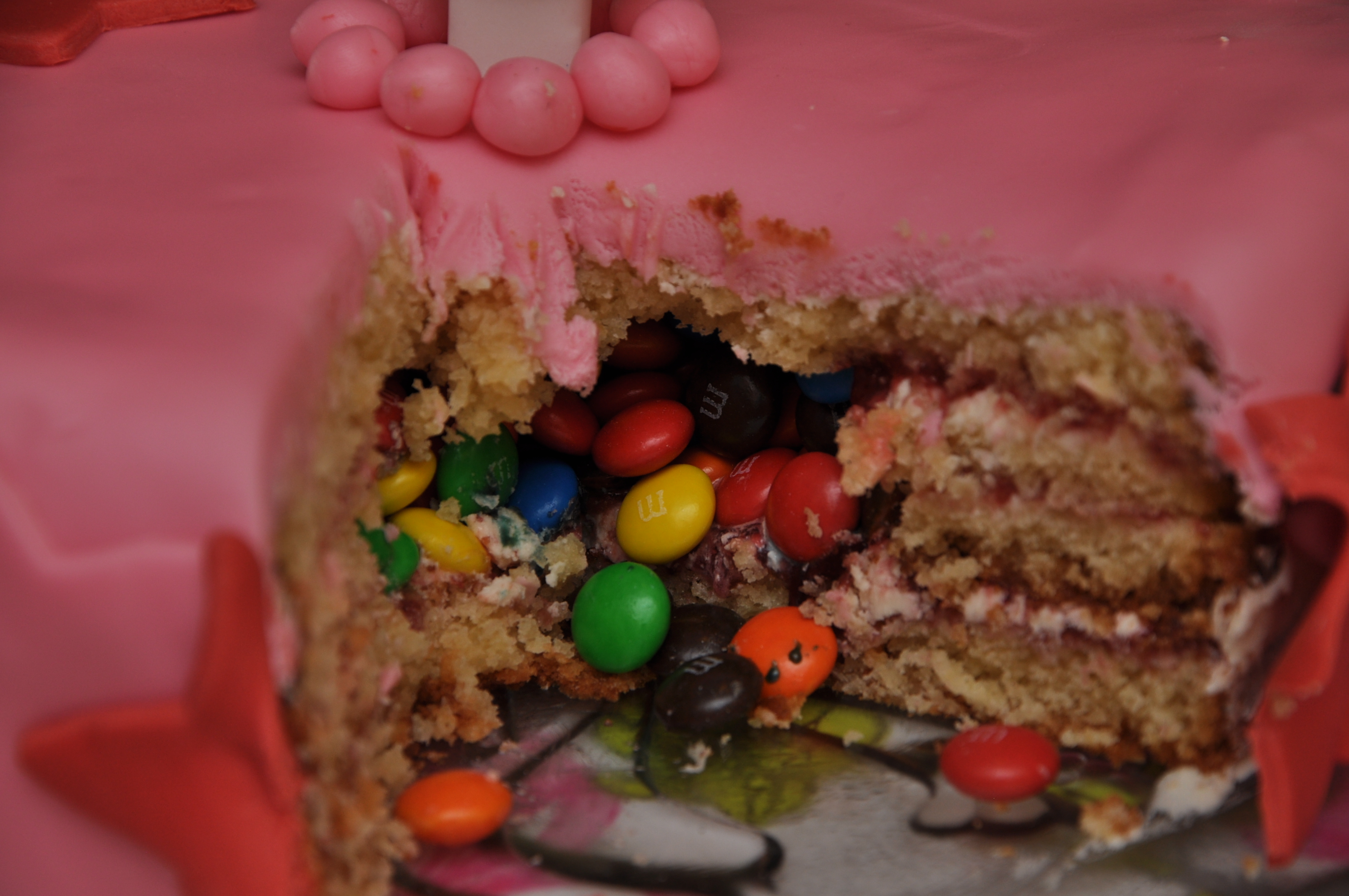 Kuten vähän aavistelin etukäteen, niin pinjata-kakku tällä ohjeella toteutettuna ei mikään makuelämys ollut. En ole suuri voikreemin ystävä, joten se jo vähän tökki, lisäksi pohja oli mielestäni liian raskaan makuinen. Ei tämä muiltakaan maistajilta saanut suurta ylistystä, mutta karkit pysyivät kohtuullisen siisteinä sisällä ja valuivat ulos hauskasti. Ja lapsi oli tyytyväinen kakkuunsa, mikä oli pääasia.