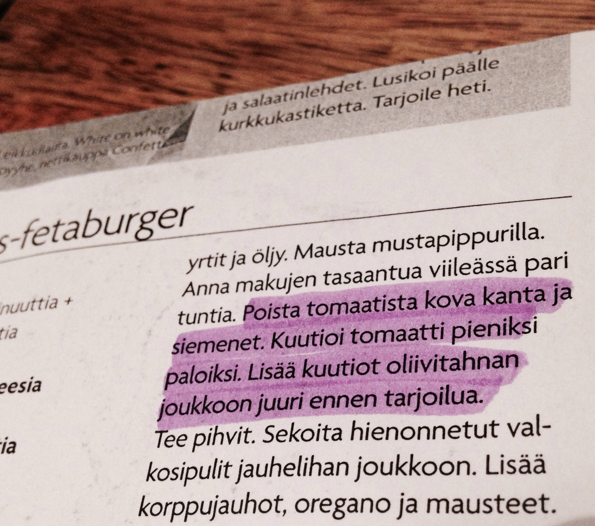Nyt täytyy tunnustaa, että bloginpitäjä on näköjään lukutaidoton 🙂 Olen tehnyt tällä ohjeella oliivitahnan kahdesti, ja vasta tänne tätä kirjoittaessani huomasin, että siihen pitää laittaa myös tomaattia! Ohje on tosiaan osa lammas-fetaburgerin ohjetta, ja se on taitettu lehden sivulle aika tiukkaan. Jotenkin sitten ymmärsin reseptin niin, että raaka-ainelistan lopussa lukeva tomaatti kuuluu burgerin ohjeeseen eikä oliivitahnaan. Ja lopetin varsinaisen ohjeen lukemisen kohtaa ”anna makujen tasaantua viileässä pari tuntia”. Hupsis.